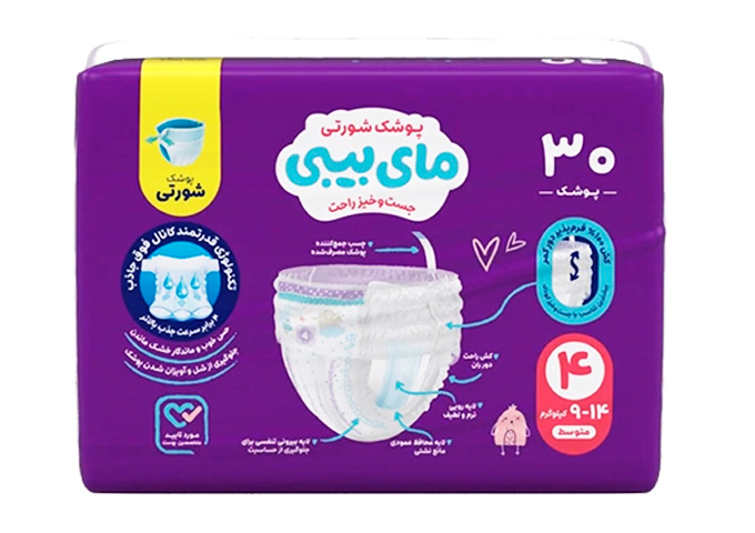 پوشک بچه مای بیبی حاوی لوسیون با عصاره بابونه می باشد. لوسیون موجود در سطح پوشک، حساسیت پوستی را کاهش می دهد و موجب شادابی پوست کودک می شود. این محصول دارای چسبهای کناری با قابلیت کشسانی متناسب با پوشک بوده و به راحتی کودک هنگام حرکت کمک می کند. این پوشک علاوه بر لطافت و نرمی ، قدرت جذب رطوبت بالایی دارد.